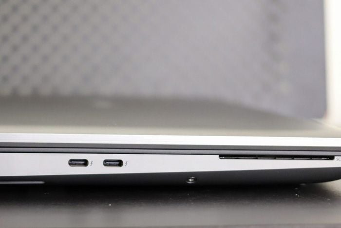 Hai cổng Thunderbolt 4 USB-C kết nối với khe cắm SmartCard ở cạnh trái của máy tính xách tay, với hai cổng USB 3.2 Loại A, khe cắm thẻ SD, giắc cắm âm thanh và khe khóa bảo mật ở bên phải. Xung quanh mặt sau, bạn sẽ tìm thấy đầu ra video HDMI và mini DisplayPort, giắc cắm Ethernet và đầu nối nguồn.
